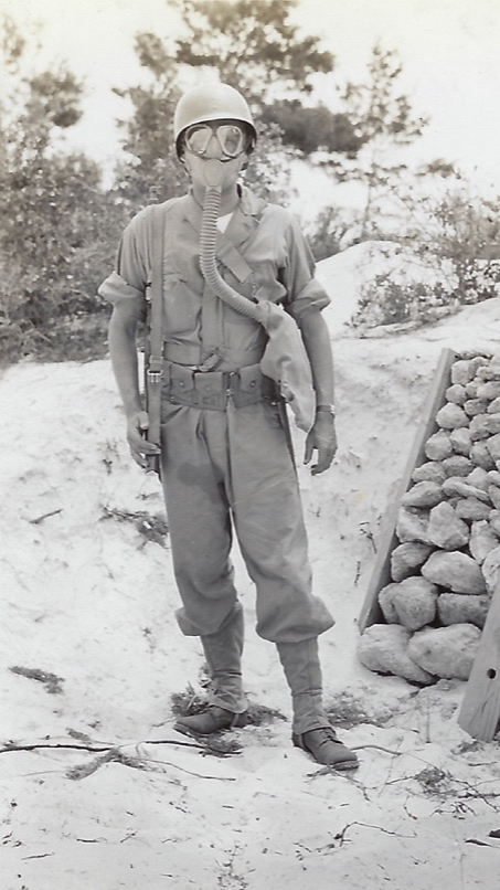To continue about the “attack”: I got out to the assembly point, after struggling into my cartridge belt and gas mask outfit (we didn’t have to put the masks onto our pack, just have the outfit strapped on). I was assigned to a post behind a clump of bushes along one of the hundreds of sandy paths leading to the camp. I cocked my trusty rifle (still no bullets, but a hell of a good click when you put the trigger) & crouched, awaiting the enemy. We would hear something rustling in the bushes and would call ‘Halt’. The creeping and crackling continues, and our hearts would beat faster, again ‘Halt, who goes there?’ Then, out would come the cutest little skunk you ever saw. I say ‘our’, as it had happened to all of us no matter where we were stationed. We had got quite friendly with them; all except for a couple of the boys. One tapped a marauding skunk on the nose with his flashlight when the skunk was inspecting the inside of the tent at night. His blanket wasn’t fit for anything but airing after that. The other fellow was on guard outside the PX. He saw a skunk a few feet off & picked up an empty beer bottle out of a case and let go at him. The skunk returned fire with much more devastating effect. The fellow had to stay on guard for 3 hours after it happened, in his skunky uniform.